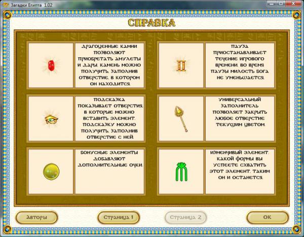 На первый взгляд все просто. Игровое поле представляет собой набор движущихся лент с отверстиями-шаблонами для элементов. В нижней части находятся шесть элементов, из которых игрок выбирает тот, который он хочет выставить на поле. Цель игрока – отвоевать у египетских богов амулеты. Именно при выставлении фигур на поле постепенно заполняется линиями текущий амулет, и как только он будет полностью заполнен, то перейдет в собственность игрока, принося ему определенное количество очков. Также игрок может зарабатывать очки за вставку фигур в отверстия лент, за заполнение полностью одной из лент (она при этом исчезает, а вместо нее появляется новая пустая). Если игроку удается поставить рядом элементы одного цвета, то полученные очки увеличиваются в несколько раз (в зависимости от того, сколько элементов удалось выставить).