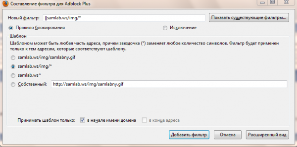 Основной её плюс – возможность вручную добавлять и редактировать ссылки для блокирования. Что очень полезно при динамических адресах рекламных картинок, которые могут находиться на субдоменах. Например: чтобы блокировать динамическую рекламу с адресов 123ad.example.com, 1234ad.example.com имеет смысл создать такой фильтр *.example.com, или *ad.example.com.