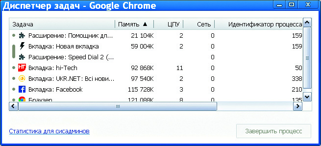В окне Диспетчера задач браузера можно не только увидеть все активные процессы, но и завершить те, которые потребляют больше всего ресурсов