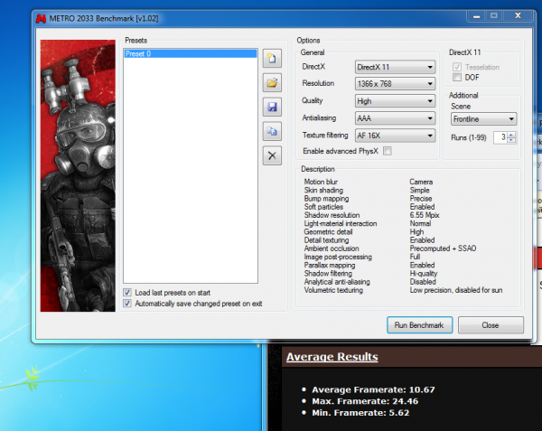 В такій вимогливій вітчизняній грі, як Metro 2033, відеокарта AMD Radeon HD 7450M показала середню кількість кадрів в 10FPS, а іноді і до 5 опускається. За таких умов наврядче можна грати у гру, допоможе тільки скидання всіх налаштувань на мінімум.
