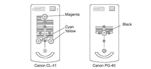 В комплекте с данными принтерами идут два картриджа, черный и цветной, PG-37 и CL-38 или PG-40 и CL-41, в зависимости от модели принтера. Для заправки картриджей нам понадобится комплект чернил, который лучше покупать в специальном магазине, а не на рынке. В комплекте идут четыре флакона с разными чернилами:Black, Yellow, Magenta, Cyan. Теперь что касается непосредственно процесса заправки. Снимаем с картриджа наклейку верхней части. Под ней будут слегка обозначенные воздушные отверстия (для черного картриджа одно, для цветного три).