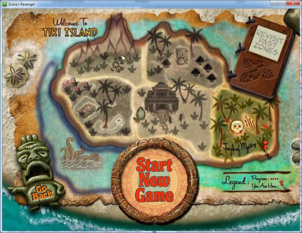 Исследуемый остров разбит на шесть локаций, одна из которых находится в прибрежных водах. В каждой из локаций необходимо пройти десять уровней. Цель каждого уровня прежняя – не пропустить цепочку разноцветных шаров к золотому черепу. Способ достижения остался без изменений – уничтожение цепочек не менее чем из трех шариков одного цвета. Также прежним остался и принцип начисления очков, только теперь можно дополнительно заработать бонусные очки, если удастся пройти уровень с первого раза. Ах, да. Только монетки из Zuma Deluxe здесь заменили фруктами. Тропики, как-никак 🙂 .