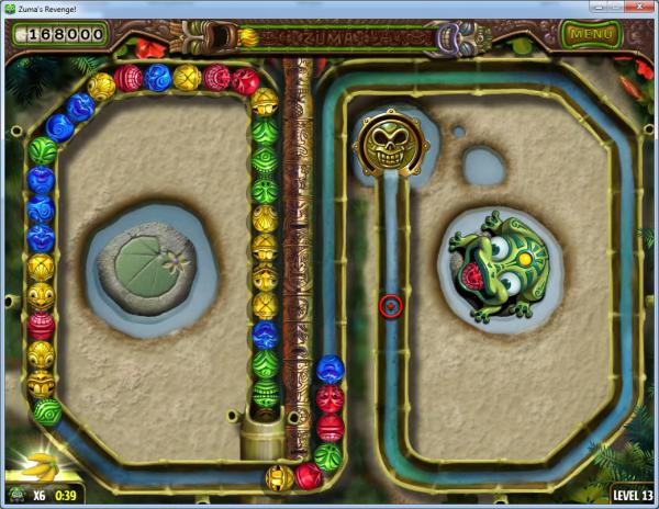 То, что уровни (не все, конечно, но в своем большинстве) стали сложнее, а траектории – закрученнее, и на них появляются тоннели (места, не доступные для выстрела) воспринимается как само собой разумеющееся, как обязательная программа по совершенствованию игры. Кроме того, в отличии от Zuma Deluxe, где лягушка на любом уровне условно говоря была неким центром траекторий, и могла вращаться во все стороны на 360 градусов, в Zuma’s Revenge встречаются уровни, где ее можно только перемещать только вдоль выбранной до нас прямой линии.