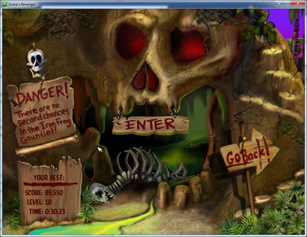 Третий режим – «Iron Frog» — это аналог режима Gauntlet из первой части игры. У игрока, входящего в соответствующую пещеру, нет права на ошибку. – борьба идет до первой смерти. Так что если череп «наелся» шариков – все, начинайте проходить сначала. Да, уровней в этом режиме всего десять, однако дизайн их такой, что все приходится делать быстро и аккуратно. Малейшее промедление или неточный выстрел – и «шеф, все пропало!», цепочка шариков резво устремляется в черепной рот. И приходится прикладывать максимум усилий и ни на секунду не терять концентрацию, чтобы успешно завершить данный режим своей победой.