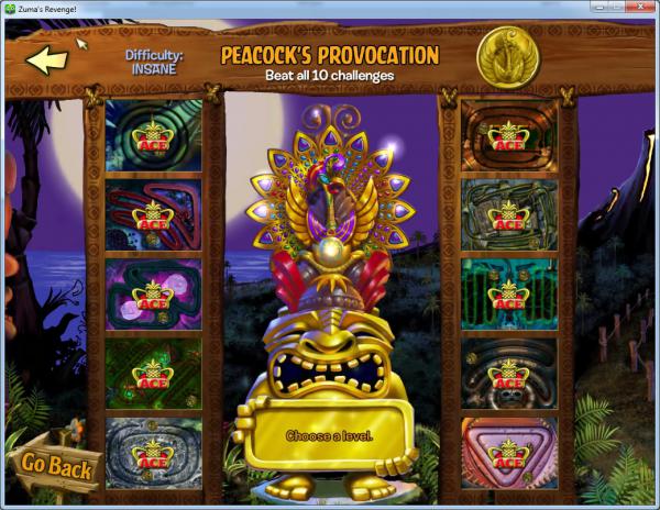 И, наконец, последний режим – это «Challenge». Еще раз обращу ваше внимание на то, что все уровни в нем будут доступны, только если вы победно завершили три вышеописанных режима. Собственно, из этого ясно, что играть мы будем на уже известных территориях. Вот только цели на этот раз другие. Уже нужно будет не только не пропустить цепочку шариков к черепу, но еще и набрать при этом заданное количество очков. На первый взгляд, задача трудновыполнимая, поскольку эта величина ряд в десять больше того количества, которое набирается в обычном режиме игры. Да еще и дополнительно ограничение по времени присутствует – на все про все игроку отводится только три минуты. Тут без божьей помощи никак не справиться.