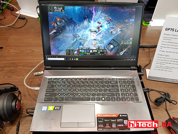 Гвоздём стенда на выставке стал мастодонт серии GT. В этом году всю мощь топового процессора и видеокарты реализовали в модели MSI GT76 Titan. Это первая модель от MSI, оснащённая полноценным процессором Intel Core i9 с разогнанными 8-ю ядрами, 16-ю потоками и рабочей частотой до 5 ГГц.