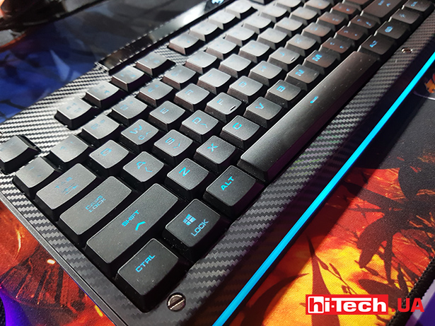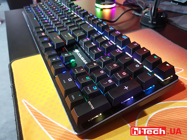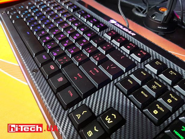 Cougar Aurora S — универсальный вариант клавиатуры с мембранными переключателями и интересном «карбоновом» оформлении. Есть 8 режимов подсветки, которые можно переключать с клавиатуры без доустановки ПО.