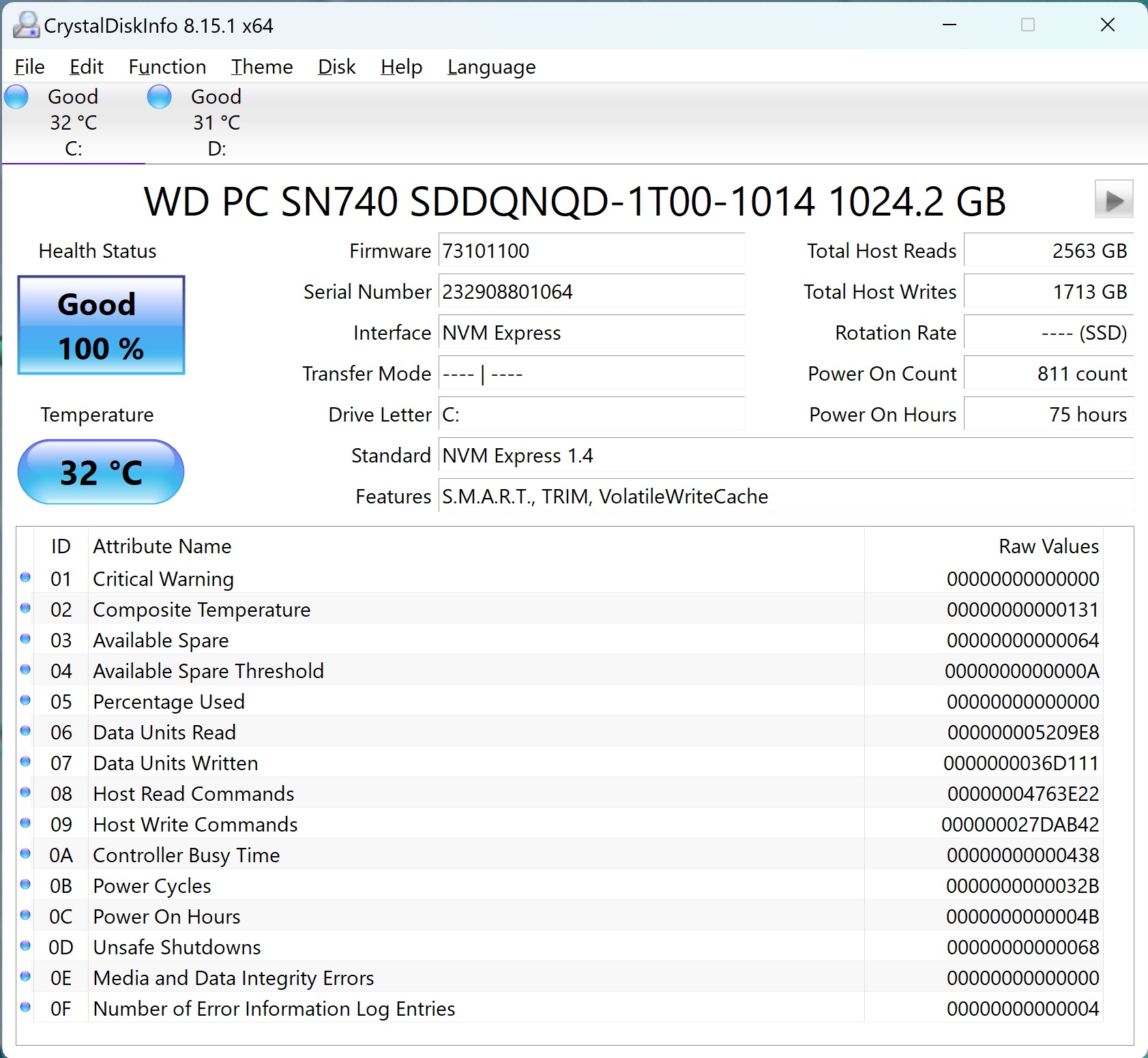 Two 1 TB solid-state drives are installed. RAM 32 GB.