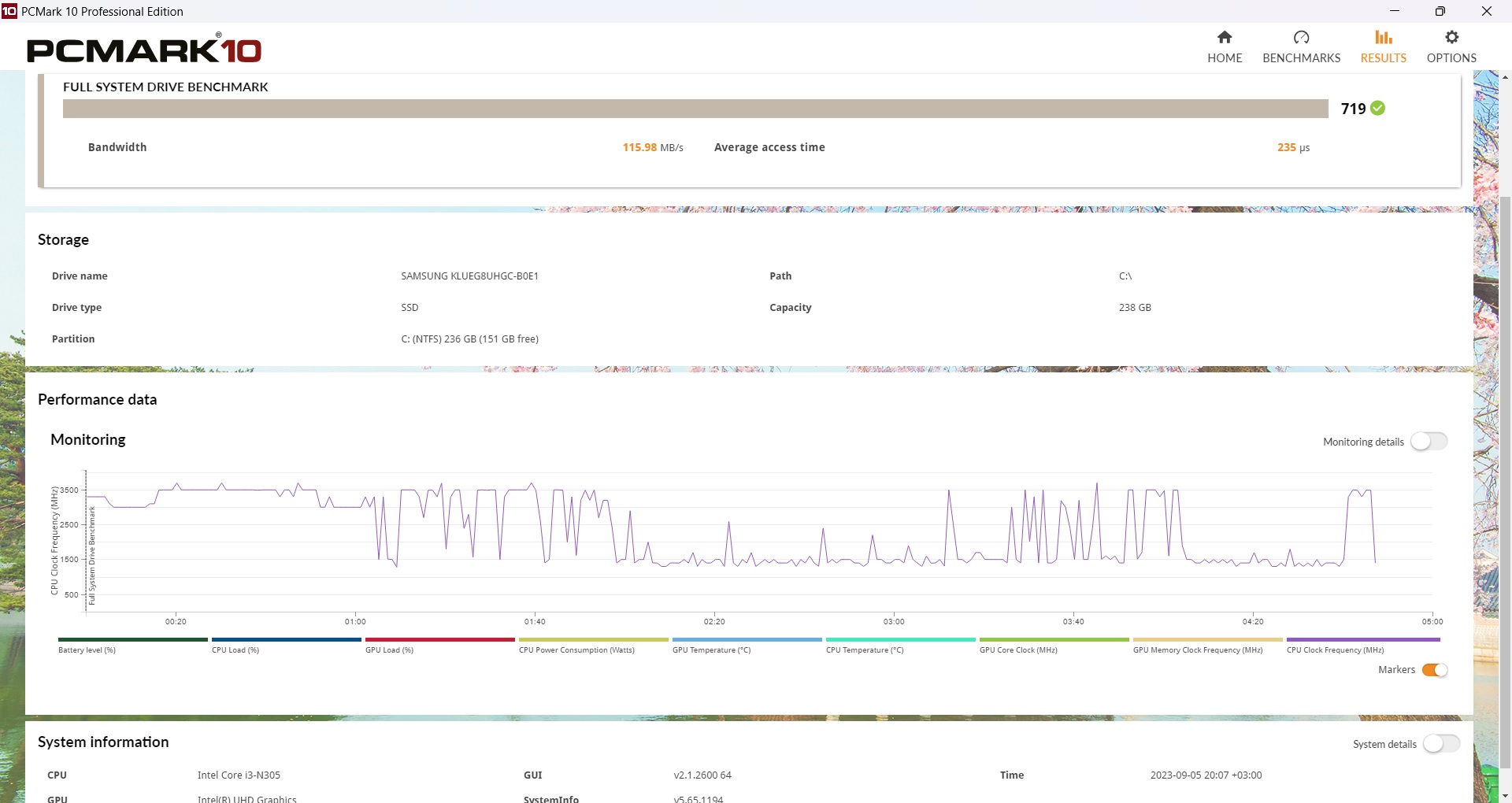 The most important feature of the installed Intel Core i3-N305 processor is its eight cores, but these are all small cores. They do not support Hyper-Threading. The chip is manufactured using a 7nm process technology. The operating frequency is 3.8 GHz, and the TDP can be no more than 15 W. This is the Alder Lake-N generation.