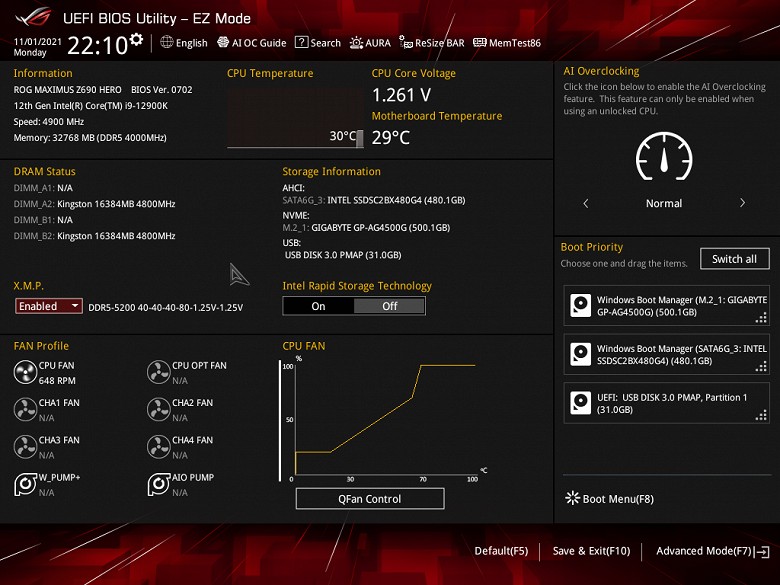 The simplified EZ Mode settings screen shows basic information about connected devices – memory, SATA drives, fans, processor, as well as processor temperature and voltage, fan speed, and system operating mode.
