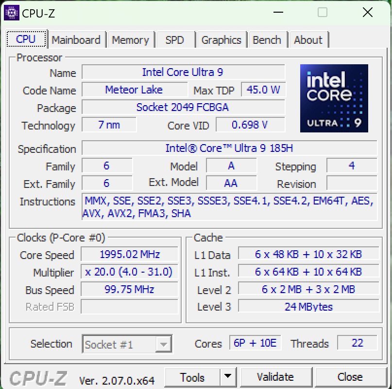 | Processor: | Intel Core Ultra 9 185H, 2.3 GHz (24 MB cache, up to 5.1 GHz, 16 cores, 22 threads) + Intel AI Boost NPU |
