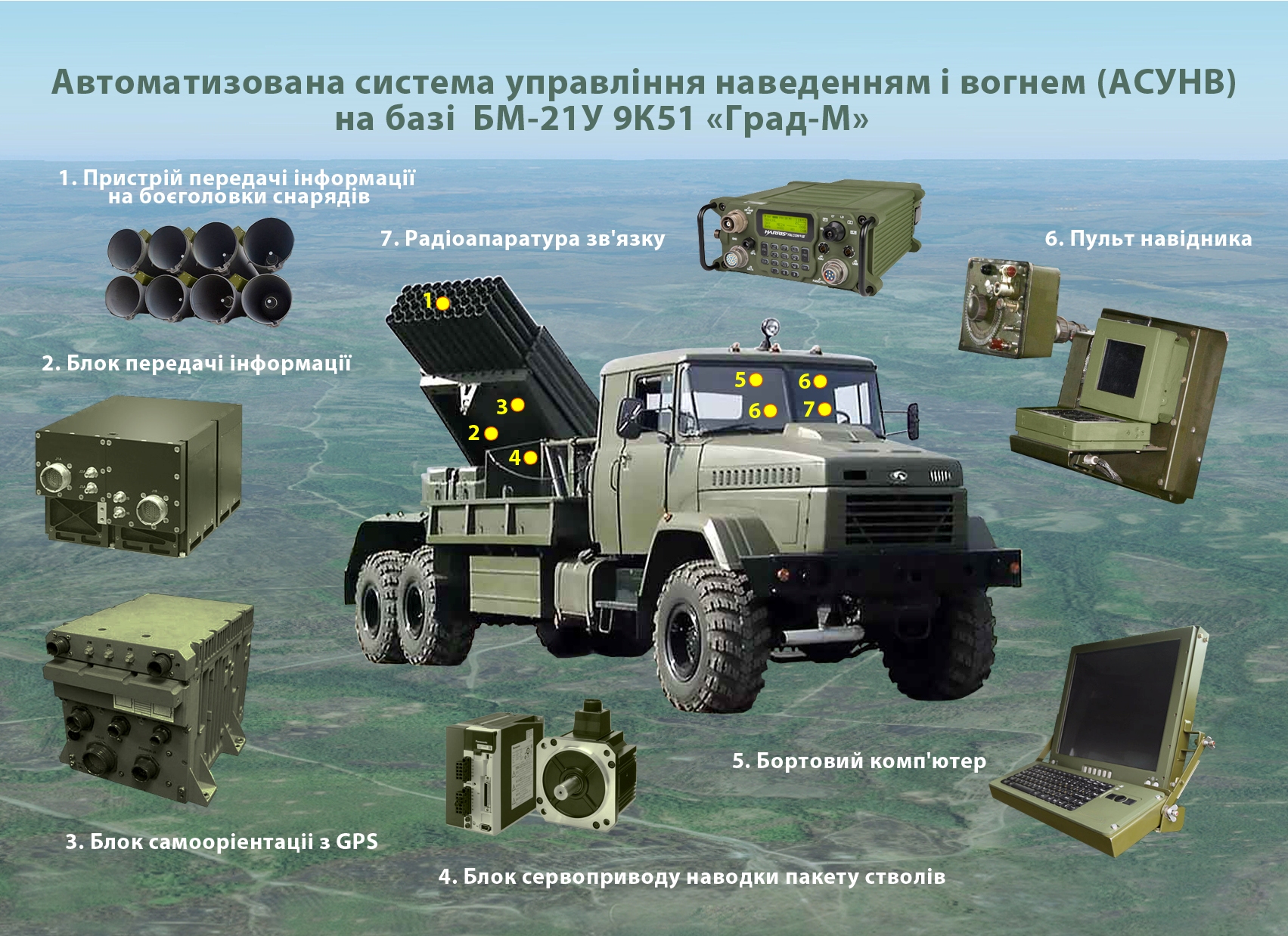 11.Modernization kit for the Grad BM-21 multiple launch rocket system. Provides equipment for the multiple launch rocket system combat vehicle with software and hardware for automatic ballistic calculations, positioning and orientation in space, exchange of target designations and commands with a control point and spotter (battlefield sensors). Completion of testing is scheduled for early 2016.