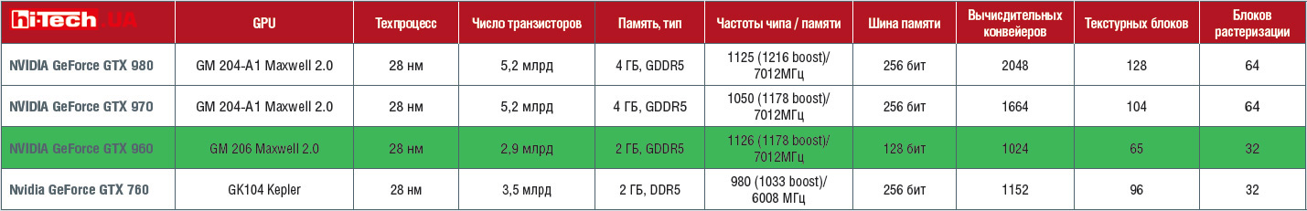 Instead of 5.2 billion transistors in the GTX 980 and 970, the GTX 960 graphics processor contains 2.9 billion. The number of computational pipelines, texture units and rasterization units is reduced (see table), and a more modest 128-bit memory bus is used.