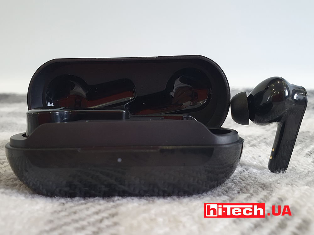 From the very beginning, the lid had a slight play, but this is not a problem for the budget segment. As practice has shown, although the backlash increases over time, it does not affect the operation in any way. The headphones are charged using a pair of contacts on the legs, and the case itself is charged via USB-Type-C. The headphones and case are available in white and black.