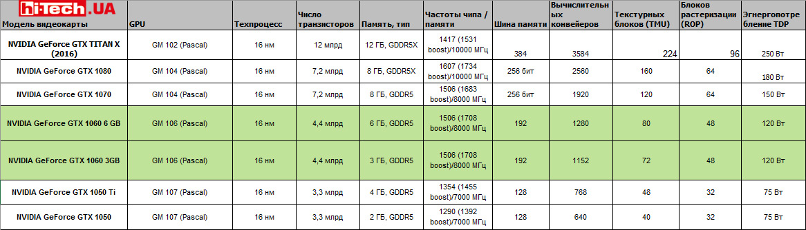 - Summary table of characteristics of video cards based on NVIDIA GeForce GTX 1060