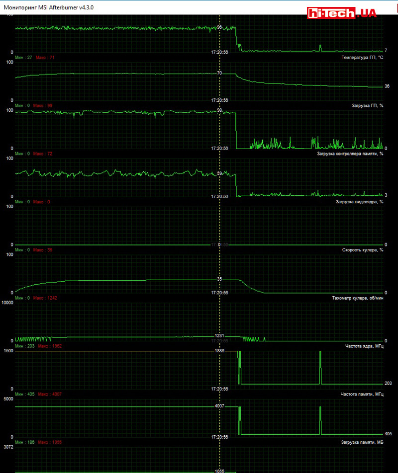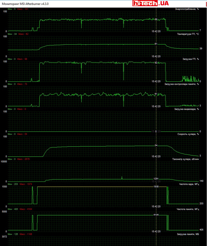 The cooling system’s performance is absolutely sufficient for efficient heat dissipation and quiet operation. The GPU temperature under load is 58 °C. By the way, this is the lowest temperature among all video cards.