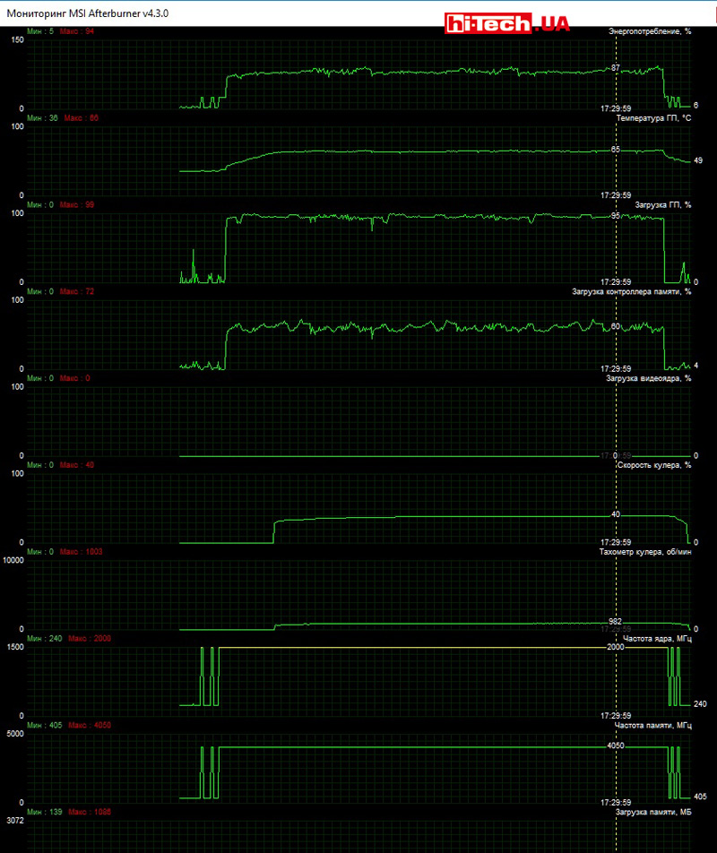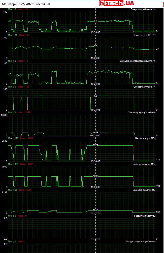 The TWIN FROZR VI cooling system with a series of heat pipes and TORX 2.0 fans does its job perfectly. The GTX 1060 GAMING X 6G turned out to be perhaps the quietest video card in the test, although it should be noted that we have no particular complaints about the other participants.