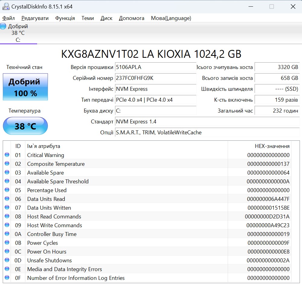 | Storage: | 1024 GB, Kioxia, SSD M.2 NVMe, PCIe 4.0 x4 |