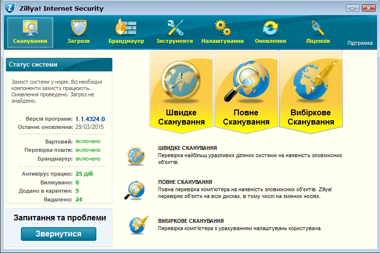 In fact, the company Zillya! There is just a free antivirus. In Zillya! Internet Security developers have added a firewall to it. But let’s start our review not with this tool, but with the interface. It is very simple and easy to use. There are no multi-level menus and many windows. All main sections (and there are seven of them) can be accessed through shortcuts on the top panel of the program. In general, the main complaint about the interface is the inability to change the window size. Otherwise, despite the slightly outdated appearance of the program, everything is fine.