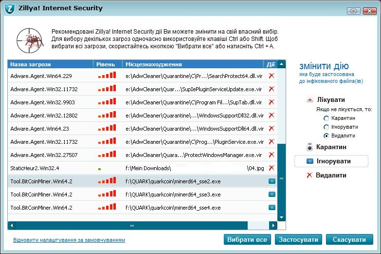 When malicious objects are detected, the program can automatically try to disinfect them, send them to quarantine, or delete them immediately. But it is better to leave the choice of action to your own discretion. For example, Zillya! Internet Security did not like the Quark cryptocurrency miner and classified it as malicious. Indeed, there is malware that secretly uses system resources to mine cryptocoins, but the antivirus seems to treat all miners with the same brush.