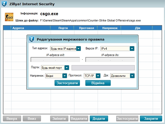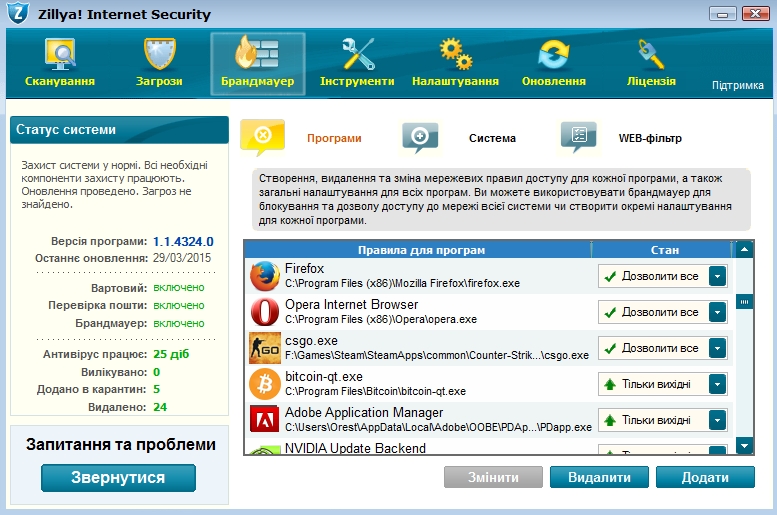 Another important module is the firewall. It works quite simply. When you first start a program that uses the network, a rule is created for it. The module analyzes its activities and sets parameters that can then be changed. Typically this only allows outgoing connections. You can customize the rules at your own discretion. In simple mode, choose to block or allow all connections; for more advanced users, set specific IP addresses and ports that programs can use. So if after installing Zillya! Internet Security Some programs have started to work incorrectly; you need to allow all connections for them in the firewall. For example, our Webmoney wallets were not replenished when the client was allowed only outgoing connections. And in order to set application rules yourself, you need to select the interactive firewall mode in the settings.