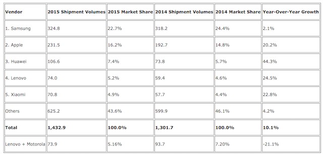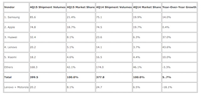 Лидерство в доли рынка (21,4%) сохранила Samsung, продав 85,6 млн звонилок по всему миру. В штуках это на 14,1% больше, чем в 2014 году когда было продано 75,1 млн устройств.