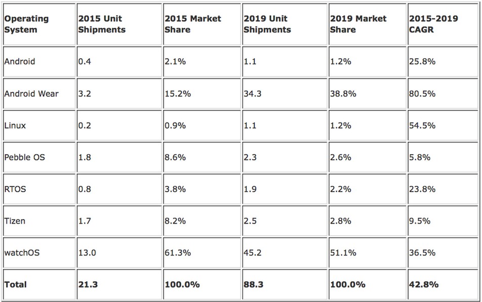 Прогнозируется рост Android Wear до 34,3 млн штук в 2019 заняв 38,8% рынка. Tizen — темная лошадка, которая, скорее всего перегонит Pebble.