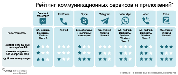 По его словам, СБУ получила от одного из бывших боевиков доказательства того, что террористы могут идентифицировать пользователей интернет-сервиса Zello и находить патриотов для расправы. Был составлен сводный рейтинг приложений на основании характеристик, которые дали опрошенные эксперты.