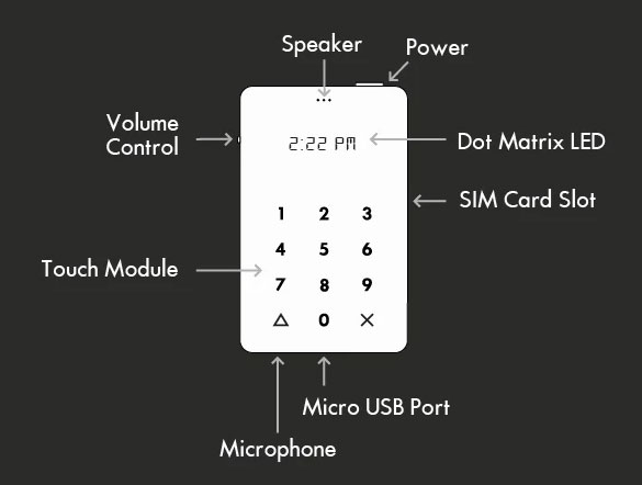 Размер смартфона составили 85,6 × 54 × 4 мм, а вес равен 38,5 г. В нём всего лишь один слот для карты mini-SIM, используя которую владелец аппарата сможет совершать и принимать звонки в сетях GSM 850/900/1800/1900 МГц и… больше ничего. Не предусмотрена даже возможность отправки и получения SMS. А небольшой монохромный матричный светодиодный дисплей способен отображать только самую важную информацию — номера телефонов, текущее время и т.п. Под ним расположена цифровая клавиатура, которая имеет достаточно яркую подсветку, чтобы в случае необходимости служить фонариком.