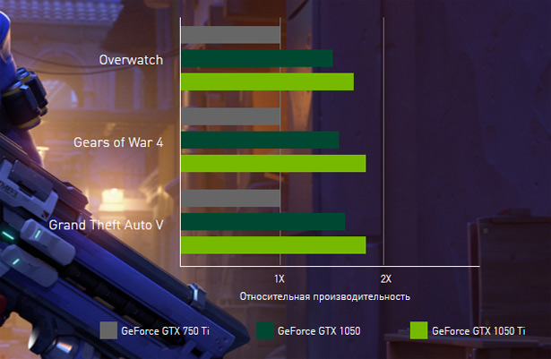 Несмотря на их позиционирование, заявляется, что NVIDIA GeForce GTX 1050 и 1050 Ti смогут обеспечить комфортный уровень производительности в популярных играх. С оптимальными настройками в таких играх, как GTA V, Dota 2, Overwatch, Gears of War 4, World of Warcraft, даже с GTX 1050, не говоря уже о 1050 Ti, которая несколько быстрее, можно получить средний уровень FPS выше 60.