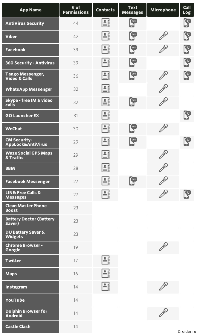 Авторы инфографики отдельно выделили информацию о наличии у приложения доступа к списку контактов, микрофону, списку вызовов и сообщениям.