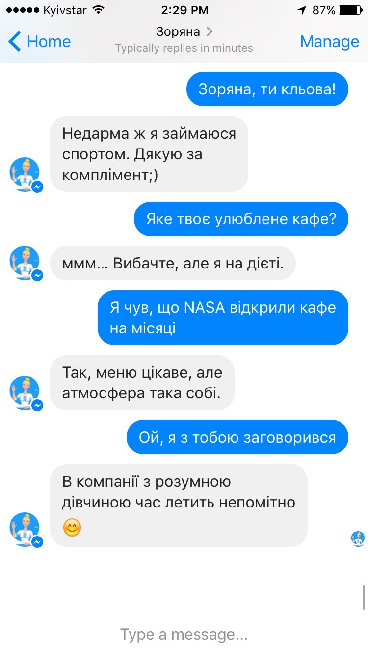 Киевстар запустил первого в Украине сервисного чата-бота в Facebook. Зоряна – это виртуальный ассистент, который отвечает на вопросы об услугах связи, помогает выбрать и подключить тариф или услугу, может поговорить с вами на отвлеченные темы и даже рассказать стихотворение.
