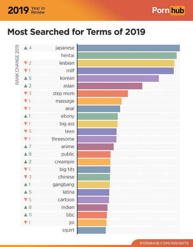 Согласно статистике поисковых запросов, самой популярной звездой в 2019 года стала 23-летняя Лана Роуд. Видеозаписи с её участием за 365 дней просмотрели больше 345,5 миллиона раз. Самыми просматриваемыми категориями в 2019 году стали японские (не анимированные) ролики. Первое место по поискам среди игр занял шутер Overwatch, на втором месте, хотя и потеряв 17 % зрителей по сравнению с 2018 годом, оказалась королевская битва Fortnite.