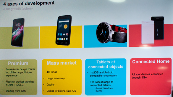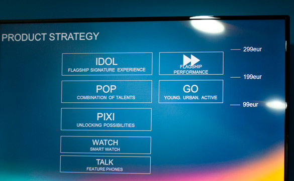 Линейка ALCATEL ONETOUCH IDOL — самые продвинутые устройства стоимостью от €200 до €300. POP — баланс стоимости и возможностей, GO — направление защищенных устройств, PIXI — недорогие смартфоны до €100, WATCH — умные часы, TALK — мобильные телефоны.