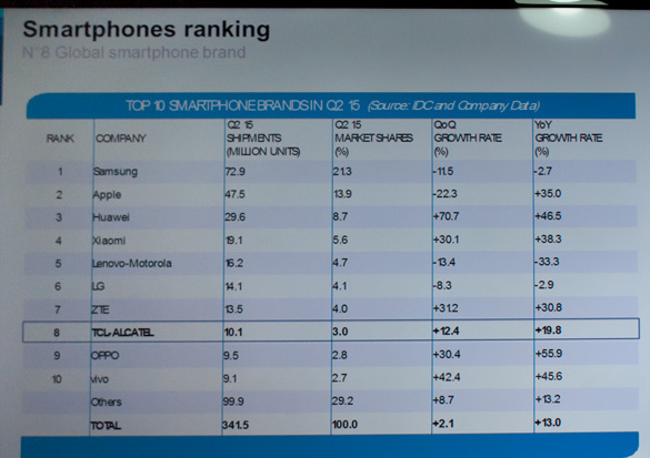 По данным IDC, по количеству отгруженных смартфонов TCL/ALCATEL ONETOUCH во II квартале 2015 года компания занимает восьмую позицию в мире