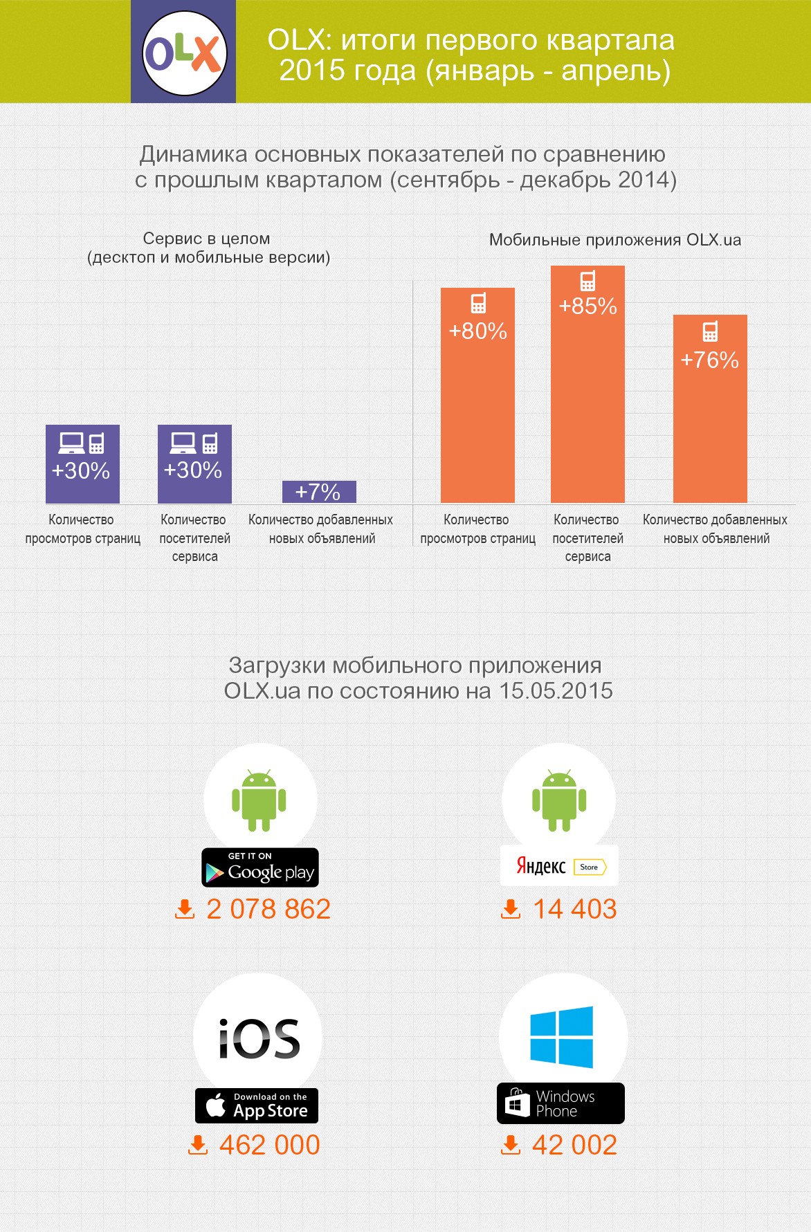 В целом в I квартале 2015 года количество посетителей и просмотров страниц OLX выросло на 30 % по сравнению с предыдущим кварталом (сентябрь – декабрь, 2014). Примечательно, что в разрезе мобильных приложений все показатели растут намного стремительнее. Так, просмотры страниц и число посетителей сервиса с мобильного приложения OLX увеличились на 80 и 85 % соответственно.