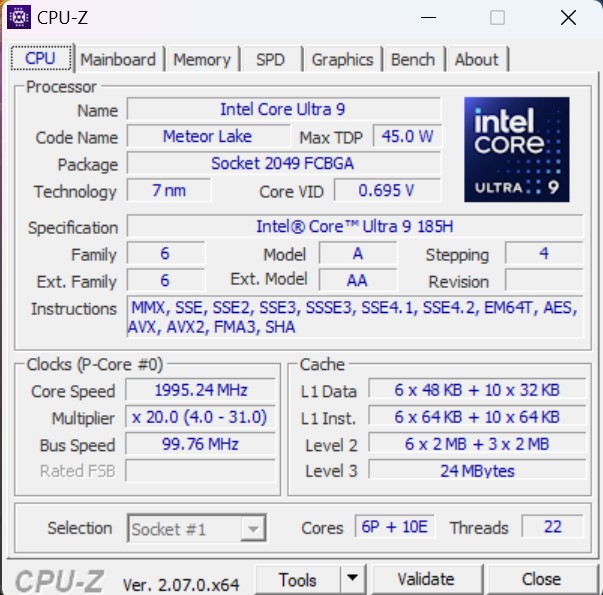 Intel Core Ultra 9 185H містить 16 ядер та підтримує 22 потоки інструкцій. При цьому конфігурація ядер передбачає використання трьох блоків: