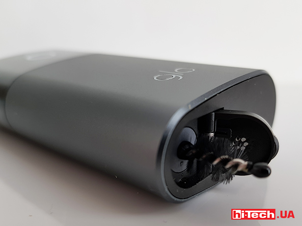 З GLO в комплекті є йоржик, який просто вставляється з одного боку та виходить з іншого. Через цей відкидний лючок біля порту зарядки. Найбільше сподобалося, що він один і немає інших дрібних інструментів. З іншого боку потрібно стежити, щоб щітка не забруднила сумку чи кишеню і не постраждала сама, тому бажано наявність кейсу чи чохла.