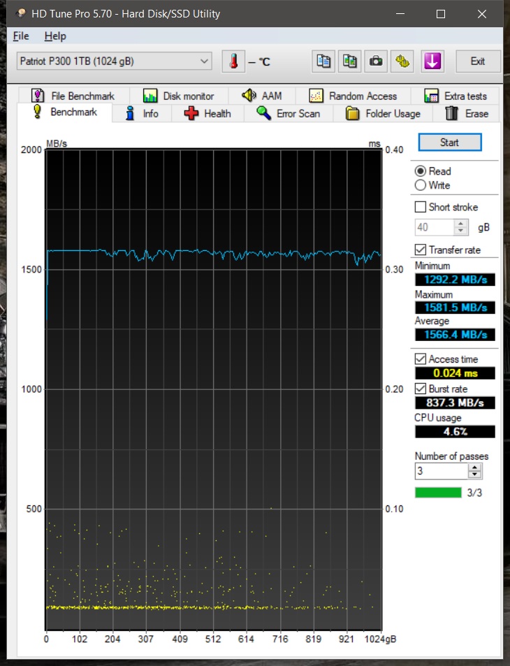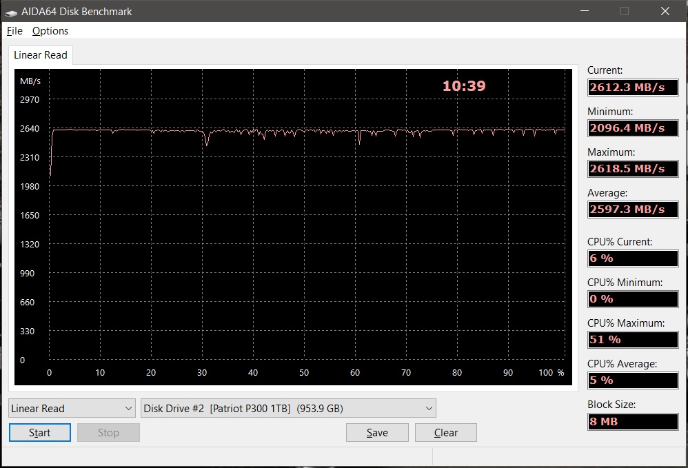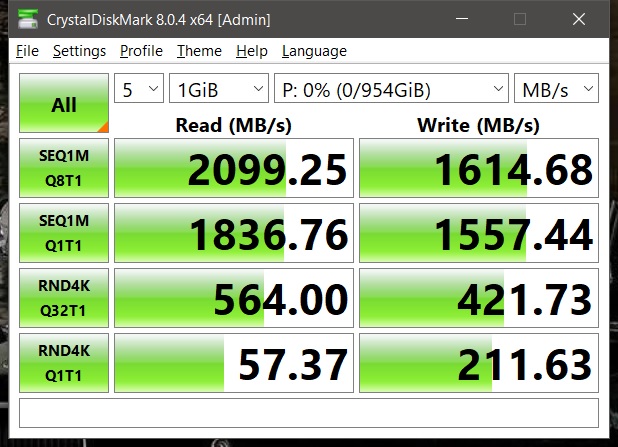 Виробник заявляє швидкість читання для версії на 1 ТБ на рівні 2100 МБ/с. Отримана в тестах швидкість зчитування та запису даних знаходиться на заявленому рівні. Часом, швидкість запису знижувалась від заявленої, тим не менш, у комплексних бенчмарках P300 показує добрий рівень продуктивності.