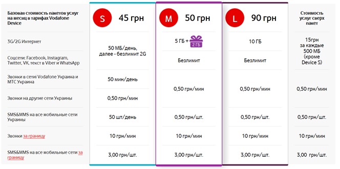 «Vodafone Украина» представил линейку тарифов Vodafone Device. Тарифы разработаны специально для «умных» и мобильных устройств. На основе анализа потребления мобильного Интернета и других услуг связи различными типами устройств оператор предложил несколько тарифов – Vodafone Device S, M и L.